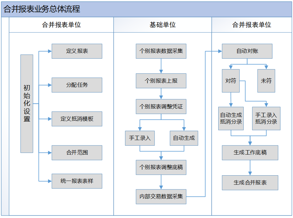 上圖描述的是一次合并的完整應用流程,是采用大合并的方式進行合并的操作步驟示意。如果整個集團采用逐級合并的方式進行合并,則每級合并主體都要經(jīng)歷上述合并過程,且上級的合并要在下級的合并完成后進行。用逐級合并的方式完成一次集團合并,相當于多個合并流程的疊加。