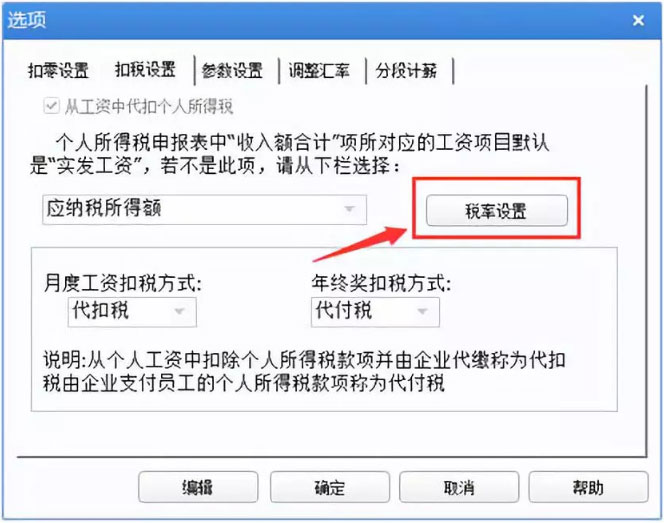 1、在薪資管理-設置-選項-扣稅設置中,點擊稅率設置,調整基數和稅率表。